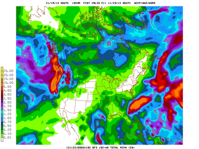 That's an unusual graphic, probably only interesting to us weather nuts. You want dry turkey this week? Try Arizona or New Mexico. Or Yuma, California. Or Maine! Here in the Northwest, it looks like non-stop rain in the lowlands while the snow piles up in the mountains. Just in time for our long trek east for Thanksgiving. It will be worth it though to see our darling little girls. Oh yea, and their hard-working parents, too :-)