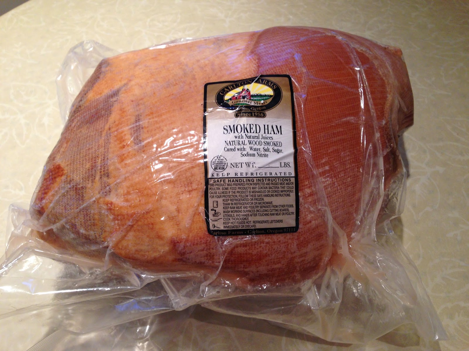 It's a good thing he took a big shopping bag and plenty of money, because she underestimated size and he lugged home this 17 pound piece of smoked piggy. The label doesn't say much, just smoked ham. Actually minimal ingredients and lack of nutritional information is kind of refreshing these days. Hey, it's a HAM. It came from a place called Carlton Farms in Oregon. Well, that should do us for Christmas dinner and leftovers into 2015.