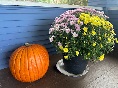 Leave it to Costco to sell the most jumbo pumpkins. I could barely lift this one into the cart yesterday, then I had to push it a quarter mile across the parking lot, like Cinderella's carriage. John lugged it up on the front porch next to the Costco mum. They make you work for your bargains.